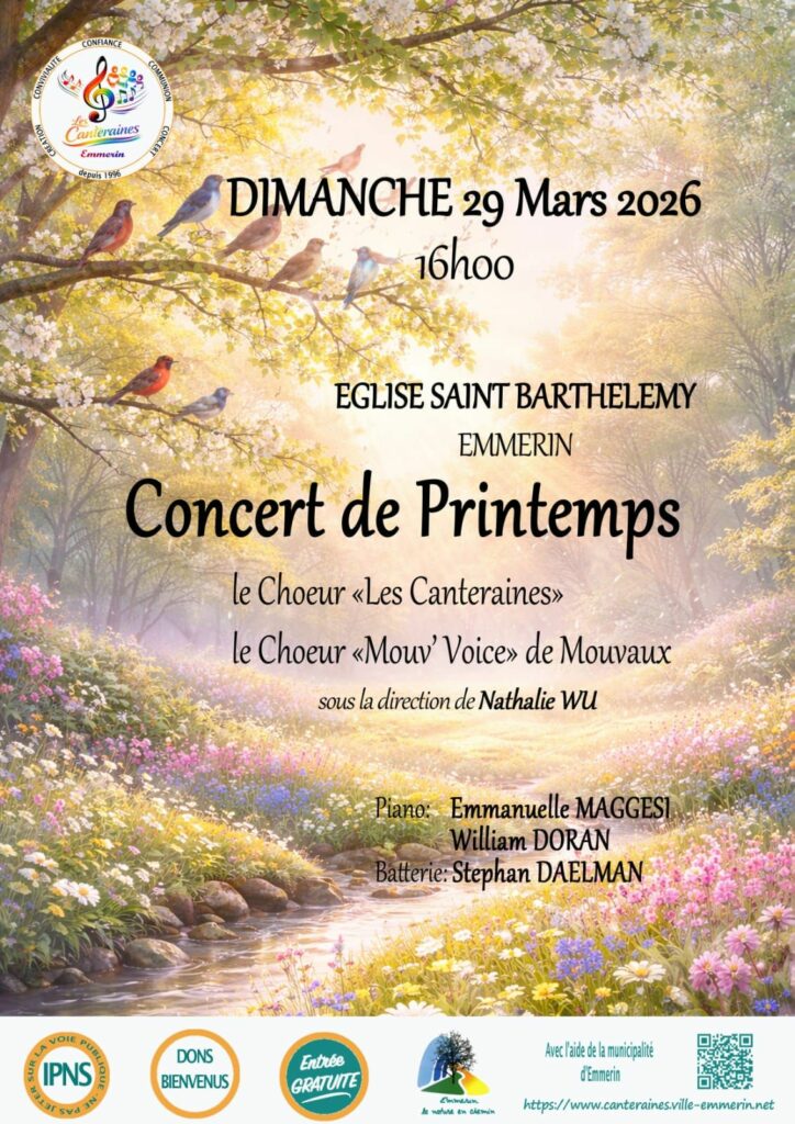 Concert de printemps par les chœurs » les Canteraines » d Emmerin et » Mouv’ voice » de Mouveaux , sous la direction de Nathalie Wu le dimanche 29 mars à 16h00 en l’église Saint Barthélémy.